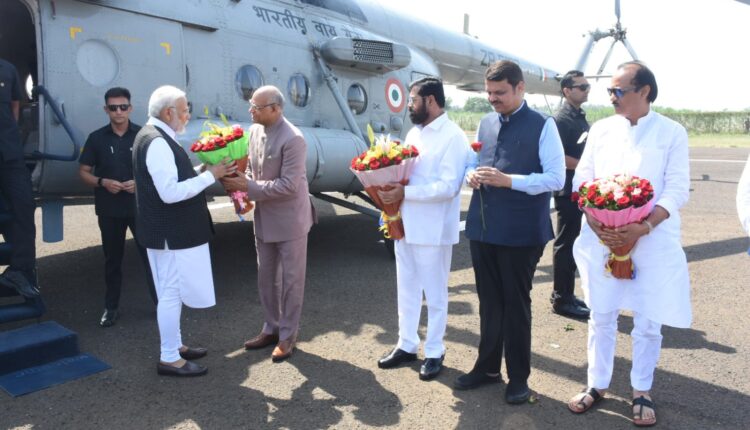 प्रधानमंत्री श्री. मोदी यांचे शिर्डी विमानतळावरून साई संस्थान हेलिपॅड येथे आगमन झाल्यानंतर राज्यपाल रमेश बैस, मुख्यमंत्री एकनाथ शिंदे, उपमुख्यमंत्री देवेंद्र फडणवीस, उपमुख्यमंत्री अजित पवार, महसूल, पशुसंवर्धन, दुग्धव्यवसाय विकास मंत्री तथा जिल्ह्याचे पालकमंत्री राधाकृष्ण विखे पाटील यांनी स्वागत केले.