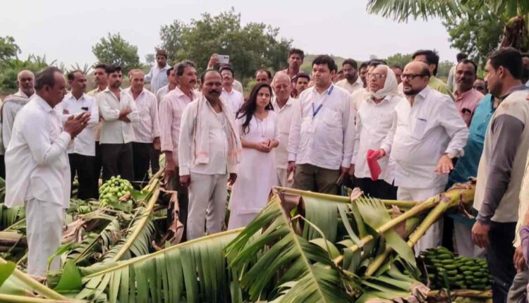 जळगाव | बुधवारी रात्री जळगाव जिल्ह्यात आलेल्या वादळी वाऱ्याने व विजाच्या कडकडाटासह झालेल्या मुसळधार पावसामुळे शेतपिकांचे मोठे नुकसान झाले. या नैसर्गिक आपत्तीत झालेल्या नुकसानीची पाहणी करण्यासाठी आज जिल्ह्याचे पालकमंत्री गुलाबराव पाटील यांनी जळगाव तालुक्यातील धानवड, उमाळा-देवरी, दापोरा या गावांना भेट दिली. यावेळी त्यांनी केळी पिकाच्या नुकसानीची पाहणी करून शेतकऱ्यांशी संवाद साधला आणि शासन मदतीसाठी कटीबद्ध असल्याचे सांगितले.